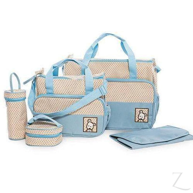 Cute and stylish, this Blue Dots 5 in 1 Multifunctional Baby Bag has it all! It is substantially roomy and will fit all baby's as well as mom's accessories. This nappy bag set consists of 5 pieces - large bag, medium bag, small food bag, bottle bag and changing pad.